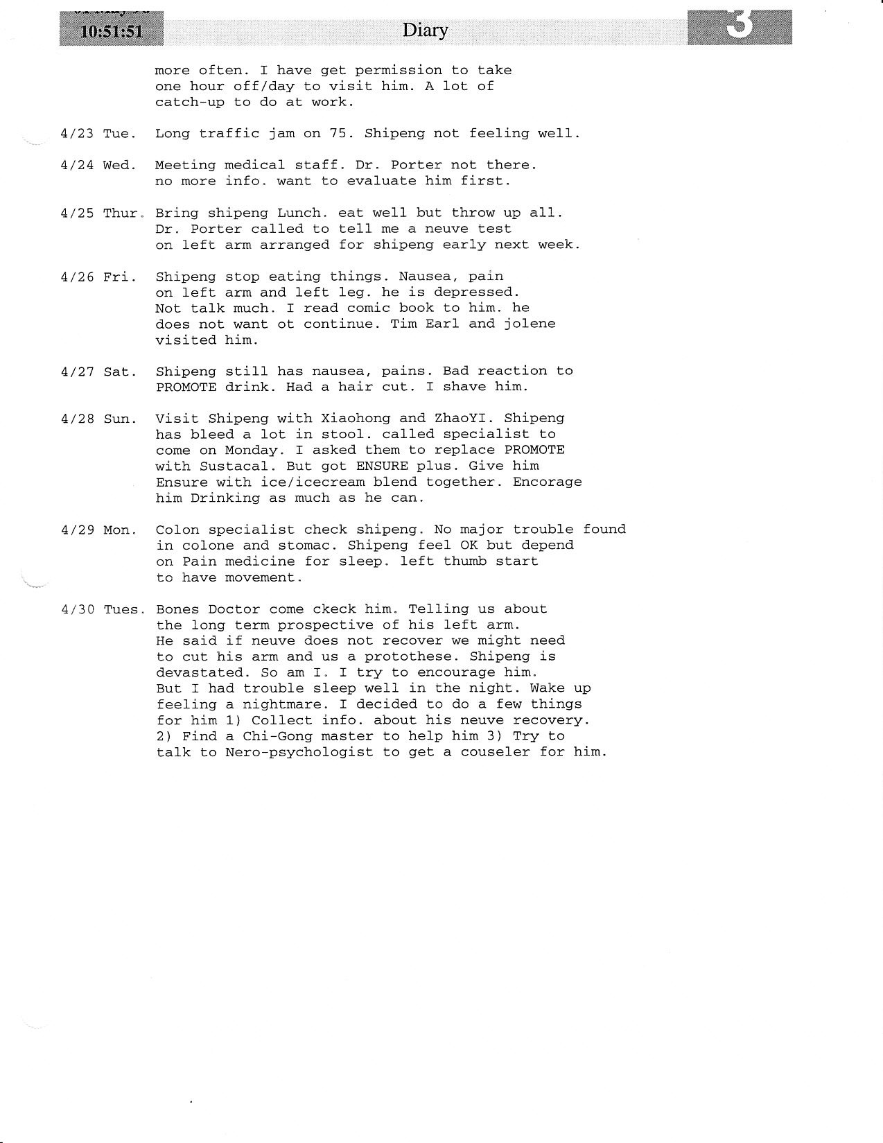 I stumble on this three page diary print out while searching for some paper records in a storage box. It was my day-by-day notes of what happen in Norman Oklahoma following his car accident in March 1996.